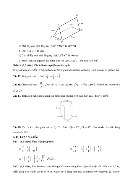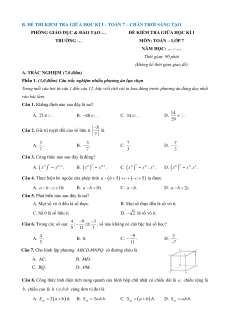 B. ĐỀ THI KIỂM TRA GIỮA HỌC KÌ I – TOÁN 7 – CHÂN TRỜI SÁNG TẠO