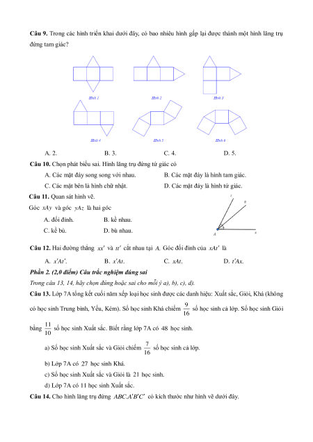 Câu 9. Trong các hình triển khai dưới đây, có bao nhiêu hình gấp lại được thành một hình lăng trụ đứng tam giác? A. 2. B. 3. C. 4. D. 5.