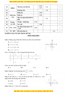 Đơn vị kiến thức Nhận Thông Vận dụng Tổng Vận dụng biết hiểu cao 1 Đồ thị, BBT C1 C39, C40 3 2 Cực trị C2 C19 C37 3 3 Đơn điệu C4 C48 2 4 Hàm số Tương giao C25 C50 2 5 Min - max C18 1 6 Tiệm cận C10 1 7 Bài toán thực tế C43 1 8 Hàm số mũ - logarit C5 1 9