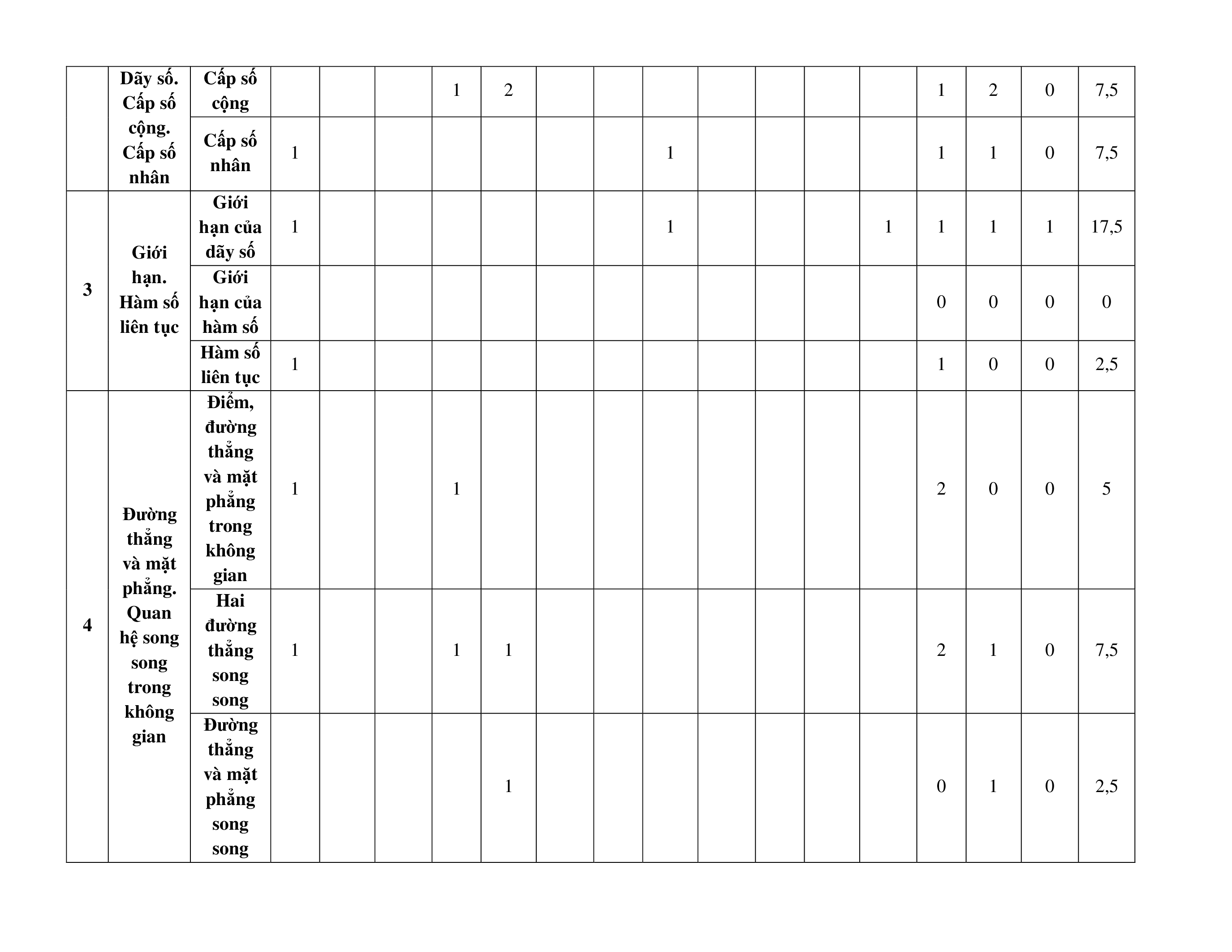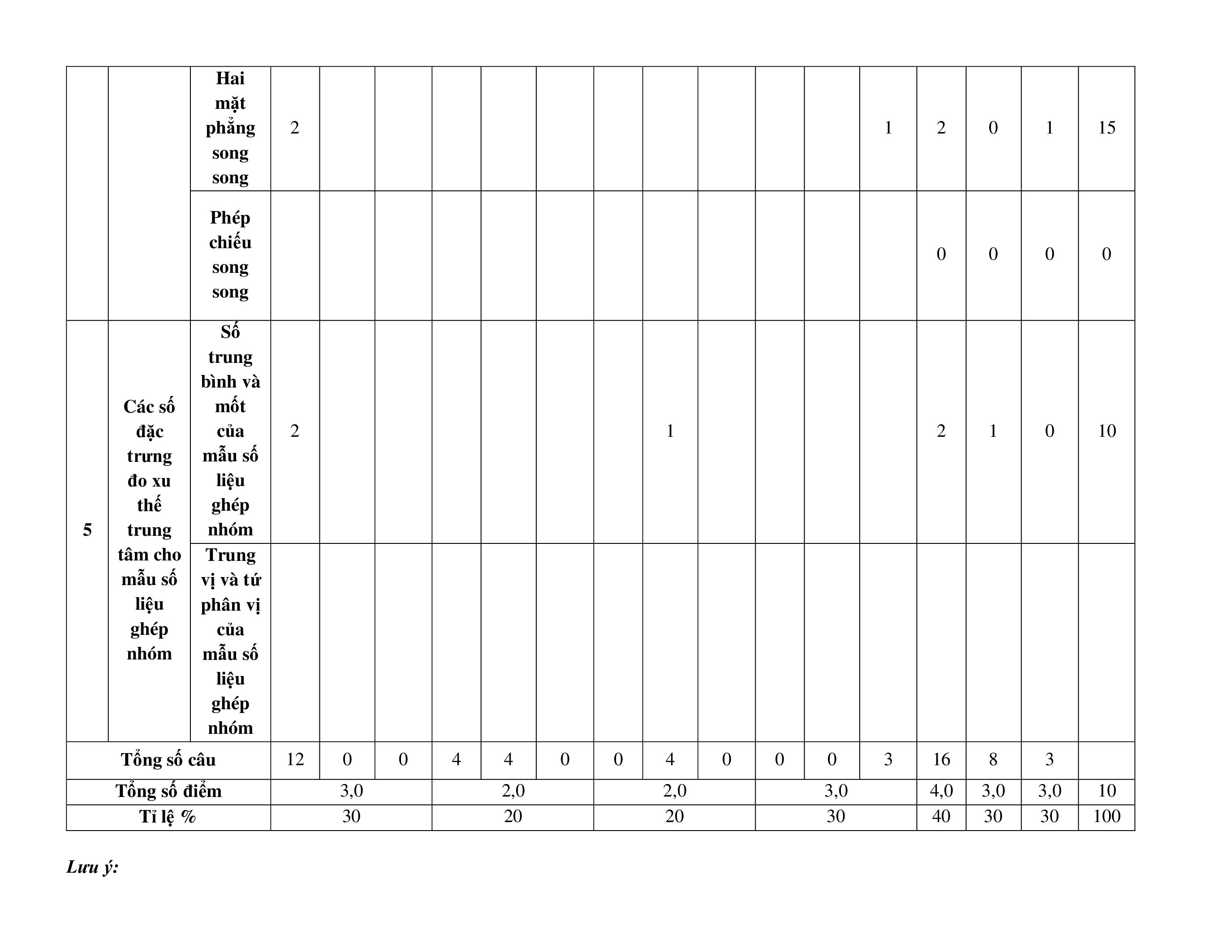 Mức độ đánh giá Tổng % Nội điểm dung TT Chương TNKQ Tự luận kiến Nhiều lựa chọn Đúng - sai Trả lời ngắn thức Vận Vận Vận Vận Vận Biết Hiểu Biết Hiểu Biết Hiểu Biết Hiểu Biết Hiểu dụng dụng dụng dụng dụng Góc lượng 0 0 0 0 giác Giá trị lượng giác của 1 1 0 0 2,5 một góc Hàm số lượng lượng giác giác và Công 1 phương thức 1 1 0 0 2,5 trình lượng lượng giác giác Hàm số lượng 1 1 0 1 1 15 giác và đồ thị Phương trình lượng 0 0 0 0 giác cơ bản 2 Dãy số 1 1 2 0 0 5 Dãy số. Cấp số 1 2 1 2 0 7,5 Cấp số cộng cộng. Cấp số Cấp số 1 1 1 1 0 7,5 nhân nhân Giới hạn của 1 1 1 1 1 1 17,5 Giới dãy số hạn. Giới 3 Hàm số hạn của 0 0 0 0 liên tục hàm số Hàm số 1 1 0 0 2,5 liên tục Điểm, đường thẳng và mặt 1 1 2 0 0 5 phẳng Đường trong thẳng không và mặt gian phẳng. Hai Quan 4 đường hệ song thẳng 1 1 1 2 1 0 7,5 song song trong song không Đường gian thẳng và mặt 1 0 1 0 2,5 phẳng song song Hai mặt phẳng 2 1 2 0 1 15 song song Phép chiếu 0 0 0 0 song song Số trung bình và Các số mốt đặc của 2 1 2 1 0 10 trưng mẫu số đo xu liệu thế ghép 5 trung nhóm tâm cho Trung mẫu số vị và tứ liệu phân vị ghép của nhóm mẫu số liệu ghép nhóm Tổng số câu 12 0 0 4 4 0 0 4 0 0 0 3 16 8 3 Tổng số điểm 3,0 2,0 2,0 3,0 4,0 3,0 3,0 10 Tỉ lệ % 30 20 20 30 40 30 30 100 Lưu ý: