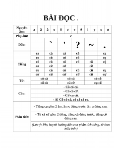 n o ô ơ p q r s t u ư v x y Âm ghi tr th nh kh gi gh bằng 2- 3 chữ ng ngh ph qu ch cái iê yê uô ươ 1 2 3 4 5 6 7 9 10 Chữ số và dấu + - > < = BÀI ĐỌC 1 Nguyên a ă â o ô ơ e ê i y u ư âm: Phụ âm: c Dấu: ` ' ? ~ . ca cà cá cả cạ co cò có cỏ cọ cô cồ cố cổ cỗ cộ Tiếng cơ cờ cớ cỡ cu cù cú củ cũ cụ cư cừ cứ cử cữ cự có cà có cá có cỗ Từ: cổ cò cá cờ cụ cố - Cò có cá. - Cô có cờ. Câu: - Cờ cu cũ.