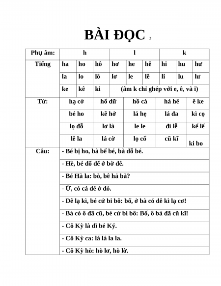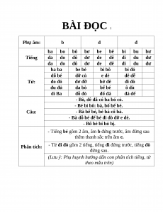 (Lưu ý: Phụ huynh hướng dẫn con phân tích tiếng, từ theo mẫu trên) BÀI ĐỌC 2 Phụ âm: b d đ ba bo bô bơ be bê bi bu bư Tiếng da do dô dơ de dê di du dư đa đo đô đơ đe đê đi đu đư ba ba be bé bi bô bí đỏ dỗ bé dỡ củ e dè dê dễ Từ: đo đỏ đơ đỡ bờ đê đi đò đu đủ da bò bế bé ô dù dì Ba đỗ đỏ đổ đá đá dế