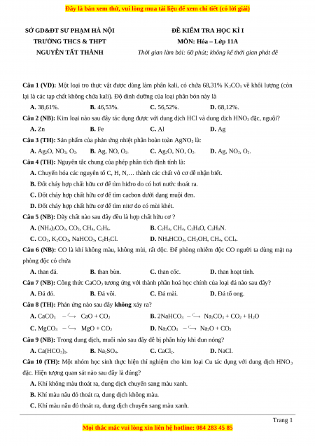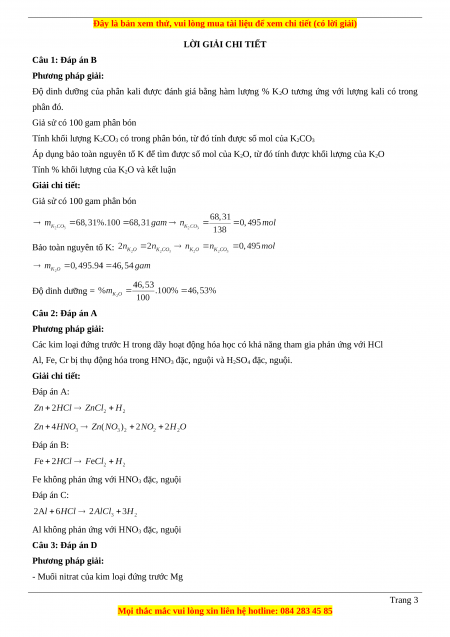 Câu 1 (VD): Một loại tro thực vật được dùng làm phân kali, có chứa 68,31% K2CO3 về khối lượng (còn