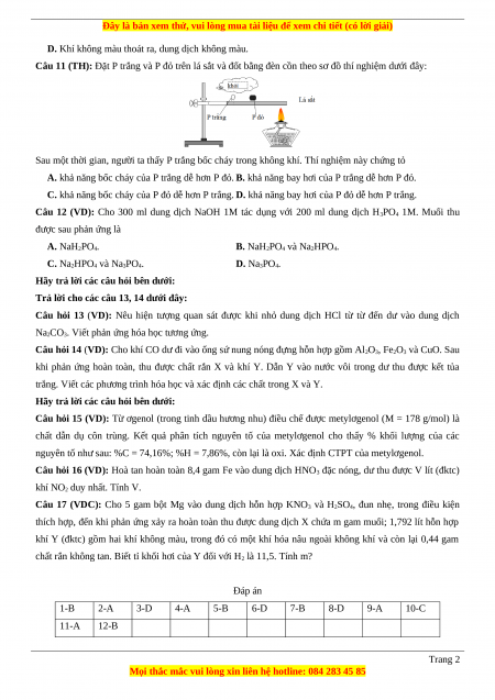 chất rắn không tan. Biết tỉ khối hơi của Y đối với H2 là 11,5. Tính m? Đáp án 1-B 2-A 3-D 4-A 5-B 6-D 7-B 8-D 9-A 10-C 11-A 12-B Trang 2