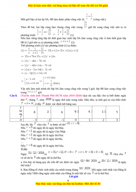 Vậy nếu làm một mình thì lớp 9A làm xong công việc trong 5 giờ, lớp 9B làm xong công việc trong giờ Câu 8.