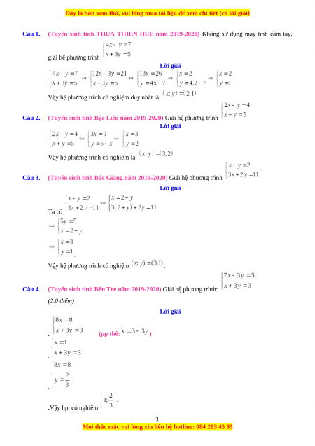 (Tuyển sinh tỉnh Bến Tre năm 2019-2020) Giải hệ phương trình: (2.0 điểm) Lời giải . (pp thế: ) . .