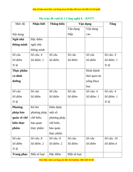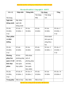 Ma trận đề cuối kì 1 Công nghệ 6 – KNTT Mức độ Nhận biết Thông hiểu Vận dụng Tổng Vận dụng Vận dụng Nội dung thấp cao Ngôi nhà Đặc điểm thông minh ngôi nhà thông minh Số câu Số câu: 4 Số câu Số câu Số câu Số câu: 4 Số điểm Số điểm: 1 Số điểm Số điểm Số điểm Số điểm: 1 Tỉ lệ Tỉ lệ Thực phẩm Hình thành và dinh thói quen ăn dưỡng uống khoa học Số câu Số câu Số câu Số câu Số câu: 4 Số câu: 4 Số điểm Số điểm Số điểm Số điểm Số điểm: 1 Số điểm: 1 Tỉ lệ Tỉ lệ Phương Kể tên Hiểu được pháp bảo phương pháp một số