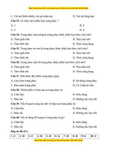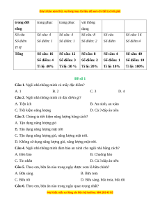 trong đời trang phục trang phục vải thông sống dụng Số câu Số câu: 4 Số câu: 4 Số câu: 8 Số câu Số câu: 16 Số điểm Số điểm: 1 Số điểm: 1 Số điểm: 2 Số điểm Số điểm:4 Tỉ lệ Tổng Số câu: 16 Số câu: 12 Số câu: 8 Số câu: 4 Số câu: 40 Số điểm: 4 Số điểm: 3 Số điểm: 2 Số điểm: 1 Số điểm: 10 Tỉ lệ: 40% Tỉ lệ: 30 % Tỉ lệ: 20% Tỉ lệ: 10% Tỉ lệ: 100% Đề số 1