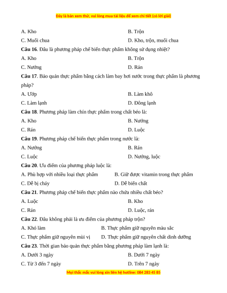 Câu 16. Đâu là phương pháp chế biến thực phẩm không sử dụng nhiệt? A. Kho B. Trộn C. Nướng D. Rán