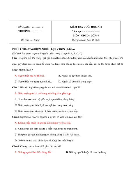 MÔN: GDCD – LỚP: 8– NĂM HỌC: .............................. Đề 1 (CTST)