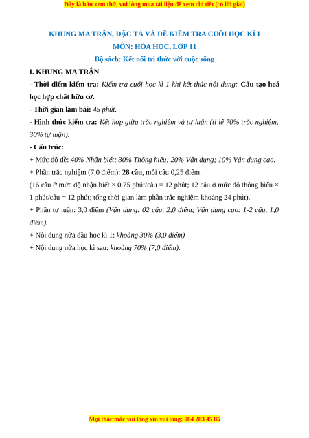 - Thời điểm kiểm tra: Kiểm tra cuối học kì 1 khi kết thúc nội dung: Cấu tạo hoá