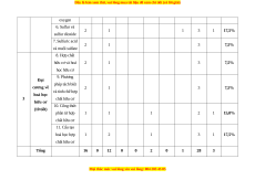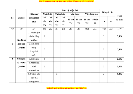 Số câu Số câu Số câu Số câu % điểm thức câu câu câu câu TN TL TN TL TN TL TN TL TN TL (1) (2) (3) (4) (5) (6) (7) (8) (9) (10) (11) (12) (13) (14) 1. Khái niệm về cân bằng 2 1 3 7,5% Cân bằng hoá học 1 hoá học 2. Cân bằng (10 tiết) trong 2 1 3 7,5% dung dịch nước. 2 Nitrogen 3. Nitrogen 1 1 2,5% và sulfur 4. Ammonia. (10 tiết) Muối 1 1 2 5,0% ammonium 5. Một số hợp 2 2 5,0% chất của nitrogen với