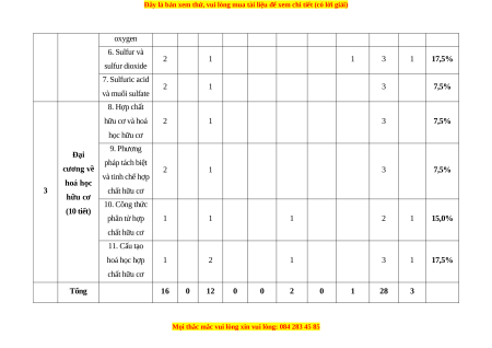 oxygen 6. Sulfur và 2 1 1 3 1 17,5% sulfur dioxide 7. Sulfuric acid 2 1 3 7,5% và muối sulfate 8. Hợp chất hữu cơ và hoá 2 1 3 7,5% học hữu cơ 9. Phương Đại pháp tách biệt cương về 2 1 3 7,5% và tinh chế hợp hoá học 3 chất hữu cơ hữu cơ 10. Công thức (10 tiết) phân tử hợp 1 1 1 2 1 15,0% chất hữu cơ 11. Cấu tạo hoá học hợp 1 2 1 3 1 17,5% chất hữu cơ Tổng 16 0 12 0 0 2 0 1 28 3