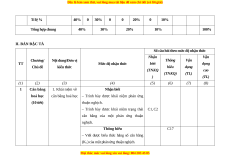 + Mức độ đề: 40% Nhận biết; 30% Thông hiểu; 20% Vận dụng; 10% Vận dụng cao.