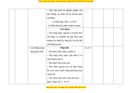 Mức độ nhận thức biết dụng Chủ đề kiến thức hiểu dụng (TNKQ cao (TNKQ) (TL) ) (TL) (1) (2) (3) (4) (5) (6) (7) (8) 1 Cân bằng 1. Khái niệm về Nhận biết hoá học