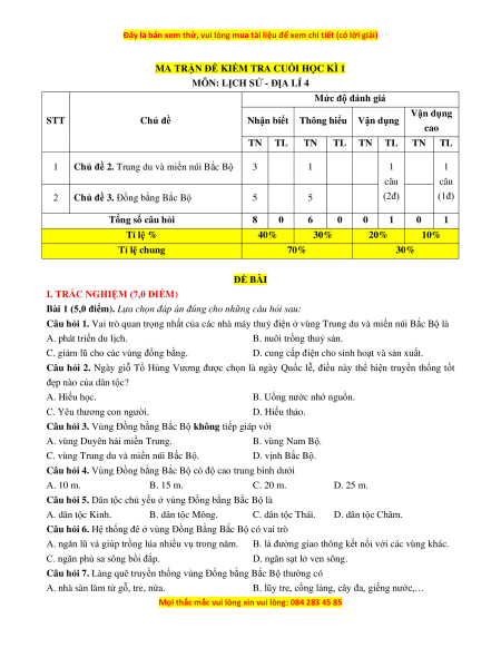 Chủ đề 3. Đồng bằng Bắc Bộ 5 5 (2đ) (1đ) Tổng số câu hỏi 8 0 6 0 0 1 0 1 Tỉ lệ % 40% 30% 20% 10% Tỉ lệ chung 70% 30% ĐỀ BÀI