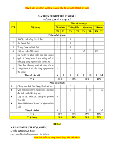 Mức độ đánh giá STT Nội dung Nhận biết Thông hiểu Vận dụng VD cao TN TL TN TL TN TL TN TL Phân môn Lịch sử 1