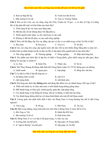Câu 10. Một trong những công trình kiến trúc tiêu biểu ở Đông Nam Á trước thế kỉ X là A. đền Ăng-co Vát. B. thánh địa Mỹ Sơn.