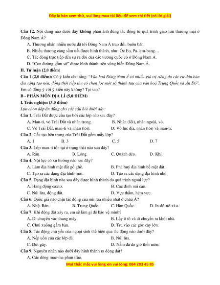 Câu 2. Cấu tạo bên trong của Trái Đất gồm mấy lớp? A. 1 B. 3 C. 5 D. 7