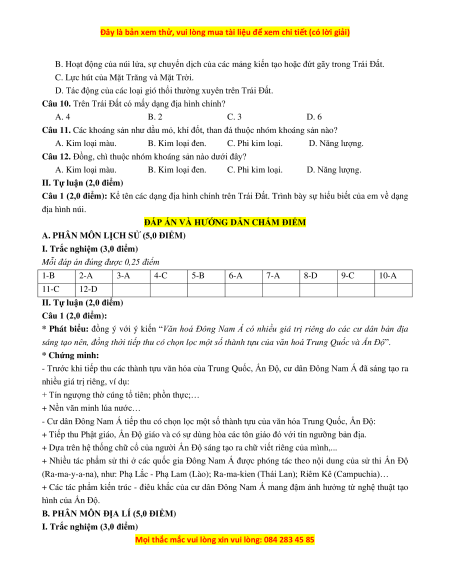 Câu 1 (2,0 điểm): Có ý kiến cho rằng: “Văn hoá Đông Nam Á có nhiều giá trị riêng do các cư dân bản