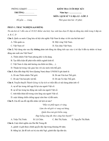 MÔN: LỊCH SỬ VÀ ĐỊA LÍ - LỚP: 5 - NĂM HỌC: …………