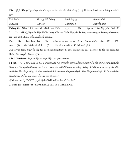 Câu 1 (2,0 điểm): Lựa chọn các từ/ cụm từ cho sẵn sào chỗ trống (…. ) để hoàn thành đoạn thông tin dưới đây Phú Xuân