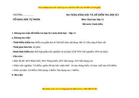 MA TRẬN, BẢNG ĐẶC TẢ, ĐỀ KIỂM TRA H C KÌ I Ọ T KHO Ổ A H C T Ọ NHIÊN Ự Môn: Sinh h c l ọ p 11 ớ Bộ sách: Cánh di u ề 1. Khung ma tr n đ ậ ki ề m tr ể a h c kì I ọ môn Sinh h c – l ọ p 11 ớ a. Khung ma trận - Thời đi m ki ể m tr ể a: Ki m tr ể a gi a h ữ c kì I ọ khi k t t ế húc n i dung: ộ Bài 12. C m ả ng ứ t ở h c v ự t ậ .