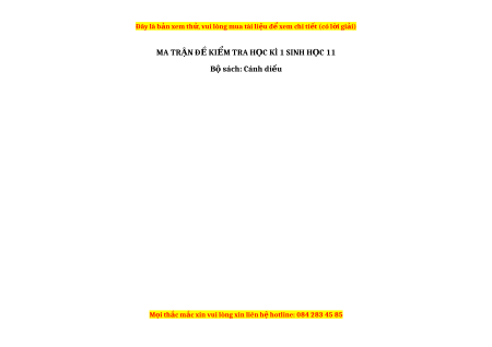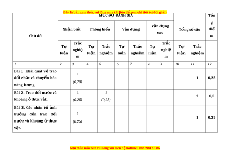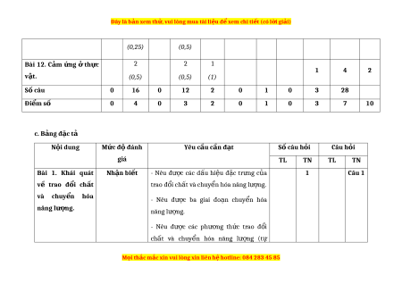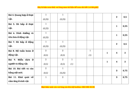 Đây là bản xem th , vui lòng mua tài li ử u đ ệ x ể em chi ti t (c ế ó l i gi ờ i) ả Bài 4. Quang h p ợ ở th c ự 1 1 2 0,5 v t ậ . (0,25) (0,25) Bài 5. Hô h p ấ ở th c ự 1 1 0,25 v t ậ . (0,25) Bài 6. Dinh d ng ưỡ và 1 1 0,25 tiêu hóa đ ở ng v ộ t ậ . (0,25) Bài 7. Hô h p ấ ở đ ng ộ 1 1 2 0,5 v t ậ . (0,25) (0,25) Bài 8. Hệ tu n ầ hoàn ở 2 2 1 1 4 2 động v t ậ . (0,5) (0,5) (1) Bài 9. Mi n ễ d ch ị ở 2 2 1 1 4 2 ng i v ườ à đ ng v ộ t ậ . (0,5) (0,5) (1) Bài 10. Bài ti t ế và cân 2 1 3 0,75 b ng n ằ i môi. ộ (0,5) (0,25)