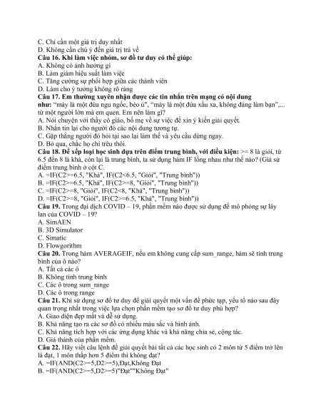 Câu 19. Trong đại dịch COVID – 19, phần mềm nào được sử dụng để mô phỏng sự lây lan của COVID – 19? A. SimAEN B. 3D Simulator C. Simatic D. Flowgorithm
