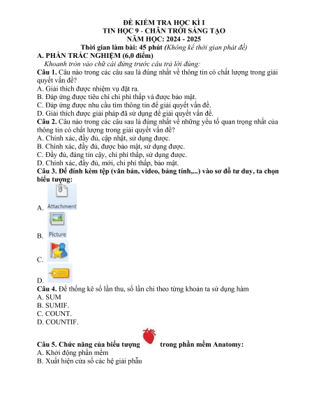 Câu 3. Để đính kèm tệp (văn bản, video, bảng tính,. .) vào sơ đồ tư duy, ta chọn biểu tượng: A. B. C. D.