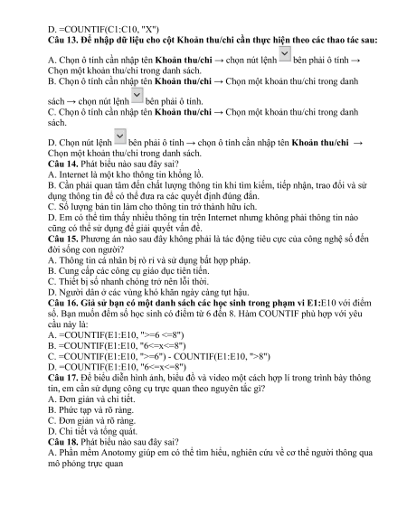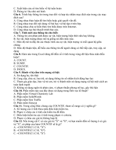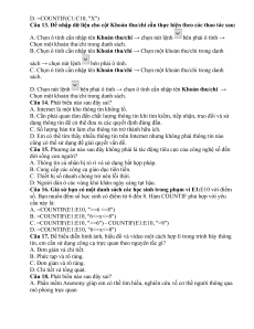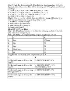 Câu 4. Để thống kê số lần thu, số lần chi theo từng khoản ta sử dụng hàm A. SUM B. SUMIF. C. COUNT. D. COUNTIF.