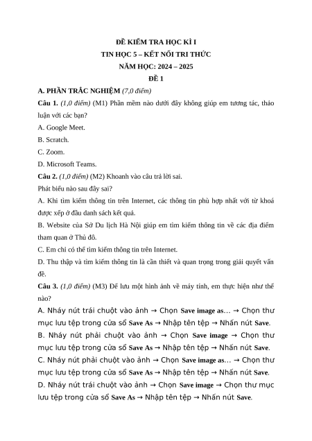 Câu 1. (1,0 điểm) (M1) Phần mềm nào dưới đây không giúp em tương tác, thảo luận với các bạn? A. Google Meet. B. Scratch. C. Zoom. D. Microsoft Teams.