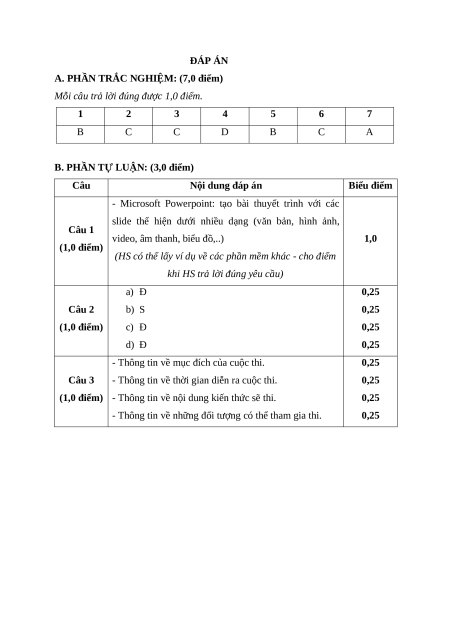 khi HS trả lời đúng yêu cầu) a) Đ 0,25 Câu 2 b) S 0,25 (1,0 điểm) c) Đ 0,25 d) Đ 0,25