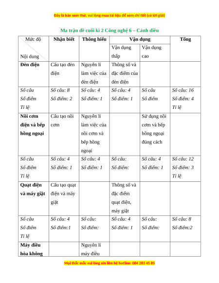 làm việc của đặc điểm của đèn điện đèn điện Số câu Số câu: 8 Số câu: 4 Số câu: 4 Số câu Số câu: 16 Số điểm Số điểm: 2 Số điểm: 1 Số điểm: 1 Số điểm Số điểm: 4 Tỉ lệ Tỉ lệ Nồi cơm Cấu tạo nồi Nguyên lí Sử dụng nồi điện và bếp cơm làm việc của cơm và bếp hồng ngoại nồi cơm và hồng ngoại bếp hồng đúng cách ngoại Số câu Số câu: 4 Số câu: 4 Số câu: Số câu: 4 Số câu: 12 Số điểm Số điểm: 1 Số điểm: 1 Số điểm: Số điểm: 1 Số điểm: 3 Tỉ lệ Tỉ lệ Quạt điện Cấu tạo quạt Thông số và và máy giặt điện và máy đặc điểm giặt quạt điện, máy giặt Số câu Số câu: 4 Số câu: Số câu: 4 Số câu: Số câu: 8 Số điểm Số điểm:1 Số điểm: Số điểm: 1 Số điểm: Số điểm:2 Tỉ lệ Máy điều Nguyên lí hòa không máy điều