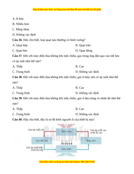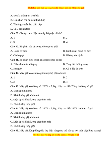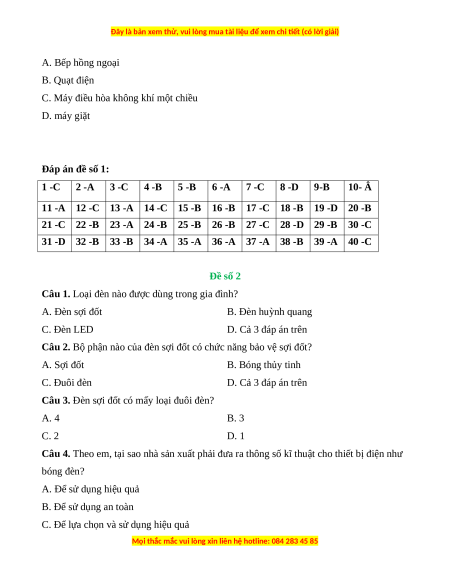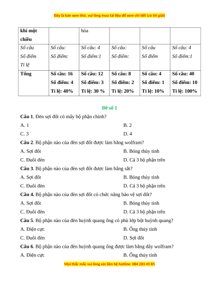 Câu 1. Đèn sợi đốt có mấy bộ phận chính? A. 1 B. 2 C. 3 D. 4