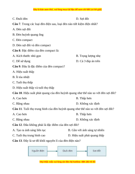 Câu 7. Trong các loại đèn điện sau, loại đèn nào tiết kiệm điện nhất? A. Đèn sợi đốt B. Đèn huỳnh quang ống C. Đèn compact