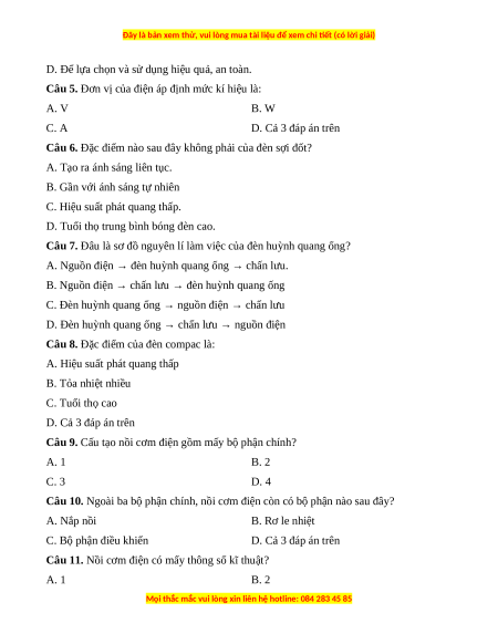 Câu 8. Đặc điểm của đèn compact là: A. Kích thước nhỏ gọn B. Trọng lượng nhẹ C. Dễ sử dụng D. Cả 3 đáp án trên