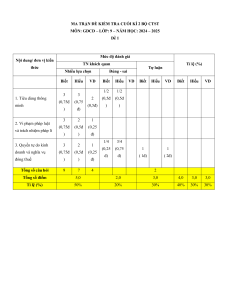 Biết Hiểu VD Biết Hiểu VD Biết Hiểu VD 1/2 1/2 3 3 1. Tiêu dùng thông 2 (0,5đ (0,5đ (0,75đ (0,75 minh (0,5đ) ) ) ) đ) 3 2 1 2. Vi phạm pháp luật (0,75đ (0,5đ (0,25 và trách nhiệm pháp lí ) ) đ) 1/4 3/4 3. Quyền tự do kinh 3 2 1 (0,25 (0,75 1 1 doanh và nghĩa vụ (0,75đ (0,5đ (0,25 đ) đ) ( 1đ) ( 2đ) đóng thuế ) ) đ) Tổng số câu hỏi 9 7 4 2 Tổng số điểm 5,0 2,0 3,0 4,0 3,0 3,0 Tỉ lệ (%) 50% 20% 30% 40% 30% 30% SỞ GD&ĐT: ………….