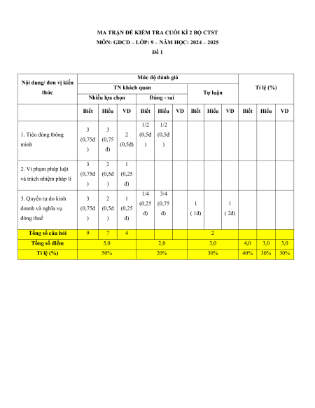 MÔN: GDCD – LỚP: 9 – NĂM HỌC: 2024 – 2025 Đề 1 Mức độ đánh giá