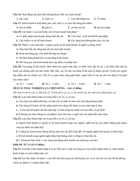 Câu 15: Hành vi nào dưới đây vi phạm quy định của Nhà nước về kinh doanh?