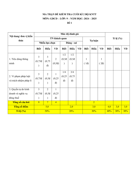 MÔN: GDCD – LỚP: 9 – NĂM HỌC: 2024 – 2025 Đề 1 Mức độ đánh giá