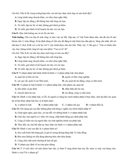 Câu 14: P 15 tuổi chơi với một nhóm bạn xấu, có hôm P cùng nhóm bạn này lấy trộm xe máy của hàng xóm.