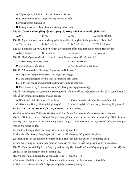 Câu 16: Người sản xuất, buôn bán hàng giả là lương thực, thực phẩm thì bị phạt tù bao nhiêu năm? A. Từ 1 – 2 năm. B. Từ 2 – 3 năm. C. Từ 2 – 5 năm. D. Từ 2 – 7 năm.