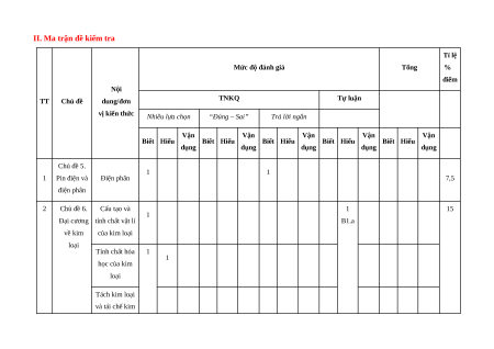 II. Ma trận đề kiểm tra Tỉ lệ Mức độ đánh giá Tổng % điểm Nội TT Chủ đề dung/đơn TNKQ Tự luận vị kiến thức Nhiều lựa chọn “Đúng – Sai” Trả lời ngắn Vận Vận Vận Vận Vận Biết Hiểu Biết Hiểu Biết Hiểu Biết Hiểu Biết Hiểu dụng dụng dụng dụng dụng Chủ đề 5. 1 1 1 Pin điện và Điện phân 7,5 điện phân 2 Chủ đề 6. Cấu tạo và 1 15 1