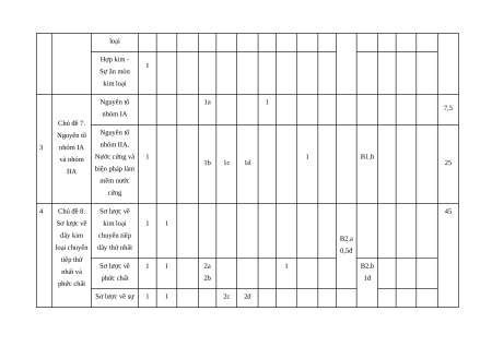 Đại cương tính chất vật lí B1.a về kim của kim loại loại Tính chất hóa 1 1 học của kim loại Tách kim loại và tái chế kim loại Hợp kim - 1 Sự ăn mòn kim loại Nguyên tố 1a 1 7,5 nhóm IA Chủ đề 7. Nguyên tố Nguyên tố 3 nhóm IA nhóm IIA. và nhóm Nước cứng và 1 1 B1.b 1b 1c 1d 25 IIA biện pháp làm mềm nước cứng 4 Chủ đề 8. Sơ lược về 45 Sơ lược về kim loại 1 1 dãy kim chuyển tiếp B2.a