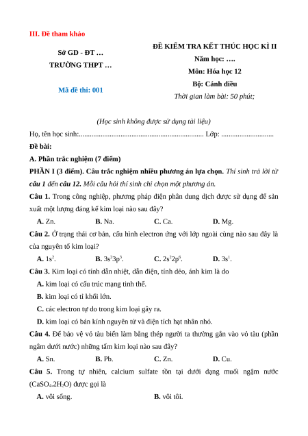 - Tailieugiaovien.com.vn giới thiệu bộ 3 đề cuối kì 2 gồm đầy đủ ma trận và lời giải chi tiết môn Hóa học 12 Cánh diều mới nhất năm 2025 nhằm giúp Giáo viên có thêm tài liệu tham khảo ra đề thi Hóa học 12.