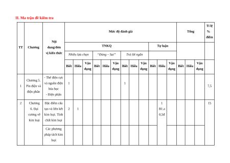 II. Ma trận đề kiểm tra Tỉ lệ Mức độ đánh giá Tổng % điểm Nội TT Chương dung/đơn TNKQ Tự luận vị kiến thức Nhiều lựa chọn “Đúng – Sai” Trả lời ngắn Vận Vận Vận Vận Vận Biết Hiểu Biết Hiểu Biết Hiểu Biết Hiểu Biết Hiểu dụng dụng dụng dụng dụng - Thế điện cực