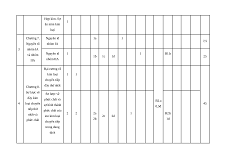 cương về kim loại. Tính 0,5đ kim loại chất kim loại Các phương pháp tách kim loại Hợp kim. Sự 1 ăn mòn kim loại Chương 7. Nguyên tố 1a 1 7,5 Nguyên tố nhóm IA 3 nhóm IA và nhóm Nguyên tố 1 1 B1.b 1b 1c 1d 25 IIA nhóm IIA Đại cương về kim loại 1 1 chuyển tiếp Chương 8. dãy thứ nhất Sơ lược về Sơ lược về dãy kim phức chất và B2.a 4 loại chuyển 45 sự hình thành 0,5đ tiếp thứ phức chất của nhất và 2 2 2a 1 B2.b ion kim loại 2c 2d phức chất 2b 1đ chuyển tiếp trong dung dịch