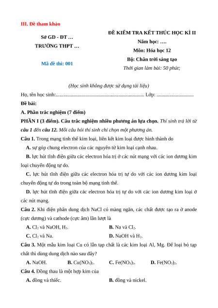 - Tailieugiaovien.com.vn giới thiệu bộ 3 đề cuối kì 2 gồm đầy đủ ma trận và lời giải chi tiết môn Hóa học 12 Chân trời sáng tạo mới nhất năm 2025 nhằm giúp Giáo viên có thêm tài liệu tham khảo ra đề thi Hóa học 12.