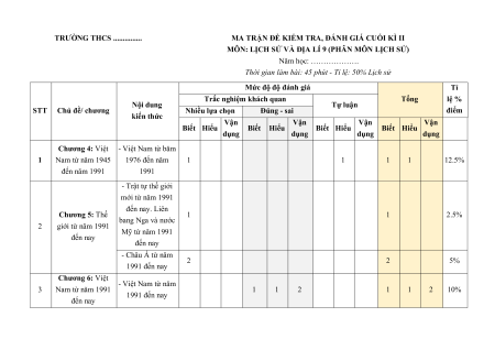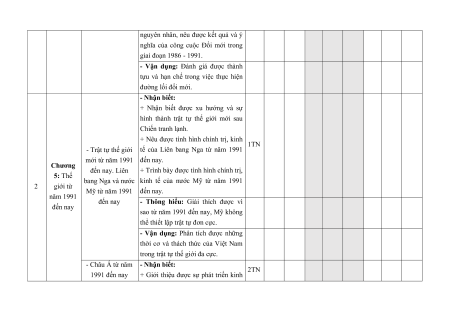 Chương 4: Việt - Việt Nam từ băm 1 Nam từ năm 1945 1976 đến năm 1 1 1 1 12.5% đến năm 1991 1991 - Trật tự thế giới mới từ năm 1991 đến nay. Liên Chương 5: Thế 1 1 2.5% bang Nga và nước 2 giới từ năm 1991 Mỹ từ năm 1991 đến nay đến nay - Châu Á từ năm 2 2 5% 1991 đến nay